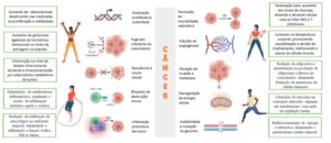 A figura a seguir esquematiza os mecanismos pelos quais o exercício físico pode exercer influência sobre os hallmarks (conjunto de capacidades adquiridas pelas células humanas no processo de transformação neoplásica) do câncer no câncer de mama. Adaptado de “Hallmarks of cancer”, by BioRender.com.